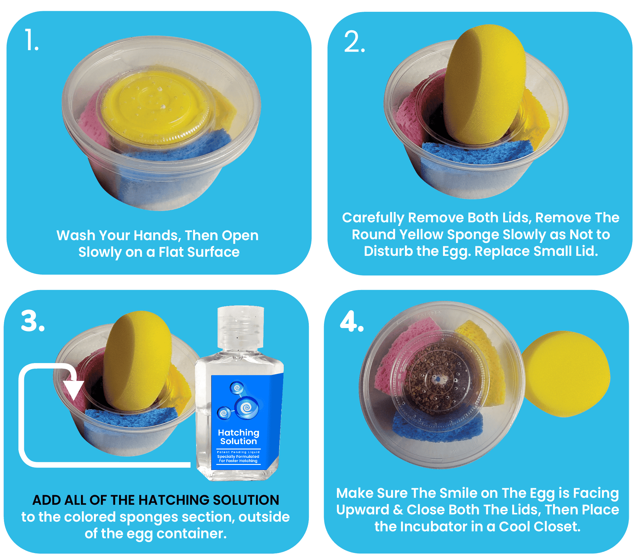 You should have received a hatching solution container in your box please add that to the colored sponges around the egg container this makes your incubator maintenance-free please put it somewhere where you can monitor it and view it without moving it. Side note in the event that the hatching solution evaporates please contact us before taking matters into your own hands please or moving the egg.
